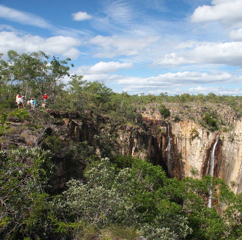 From there, we continue across the plateau, passing through the largest patch of open country rainforest in the park, to the top of Graveside Gorge (Bilkbilkmi) where a double waterfall drops 100 metres into a pool in the gorge below.