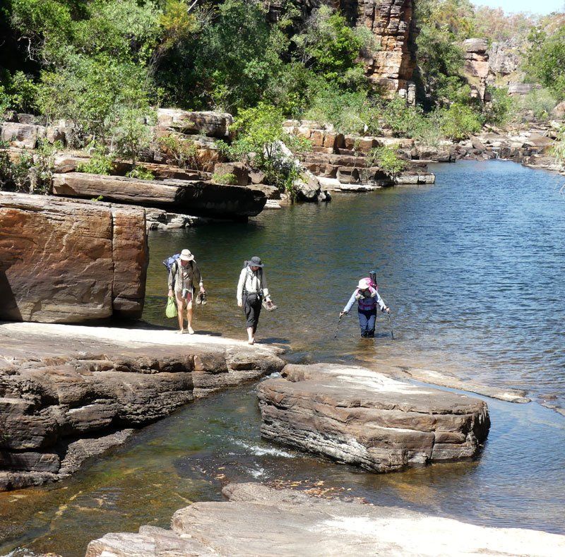 After collecting our food drop, we make our way across the plains and climb up the escarpment to enjoy the views and pools at Surprise Falls.