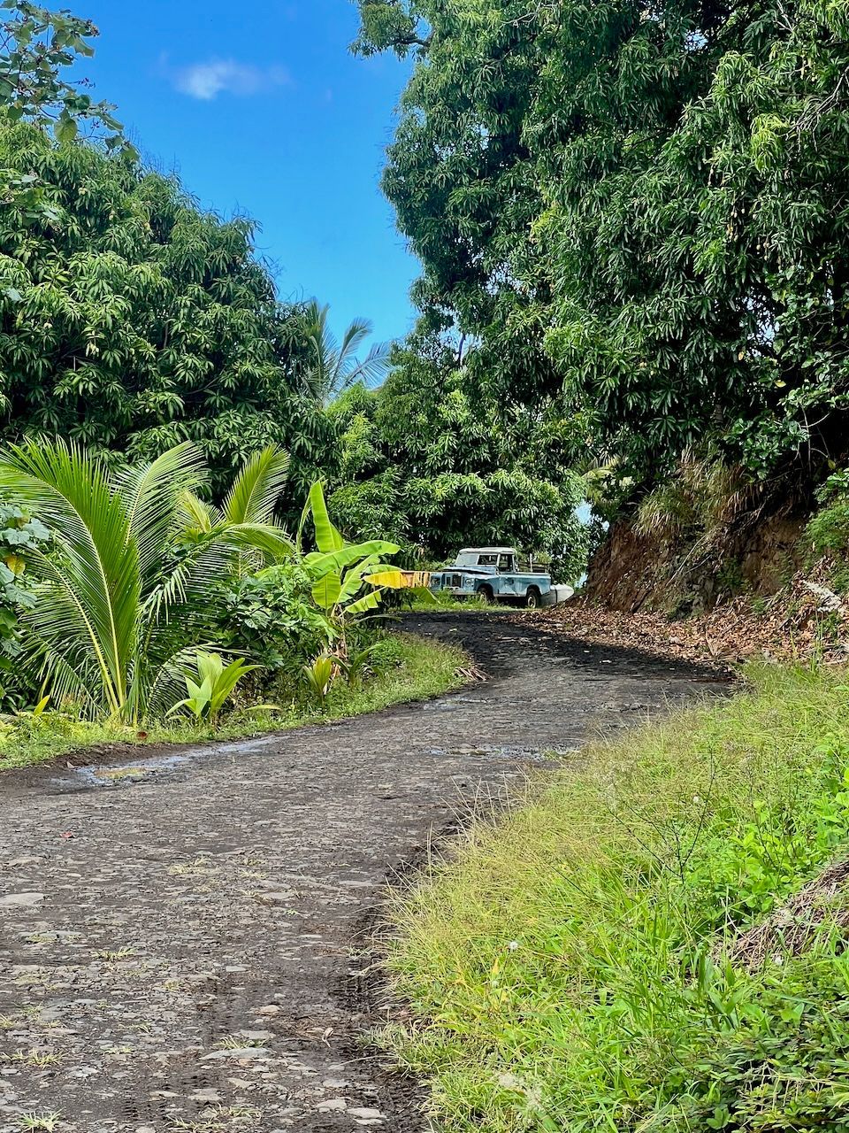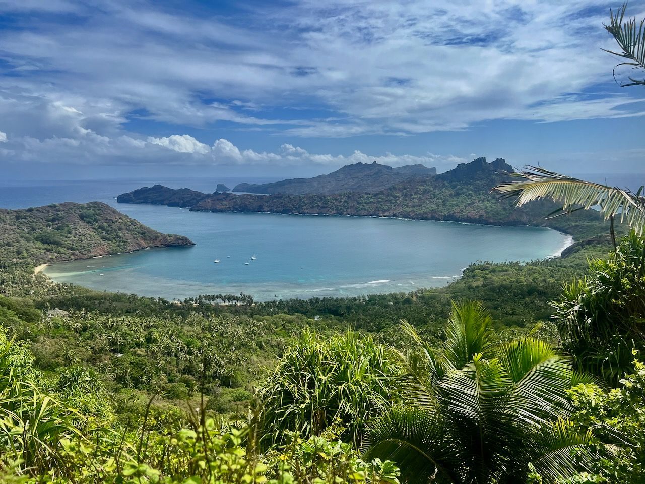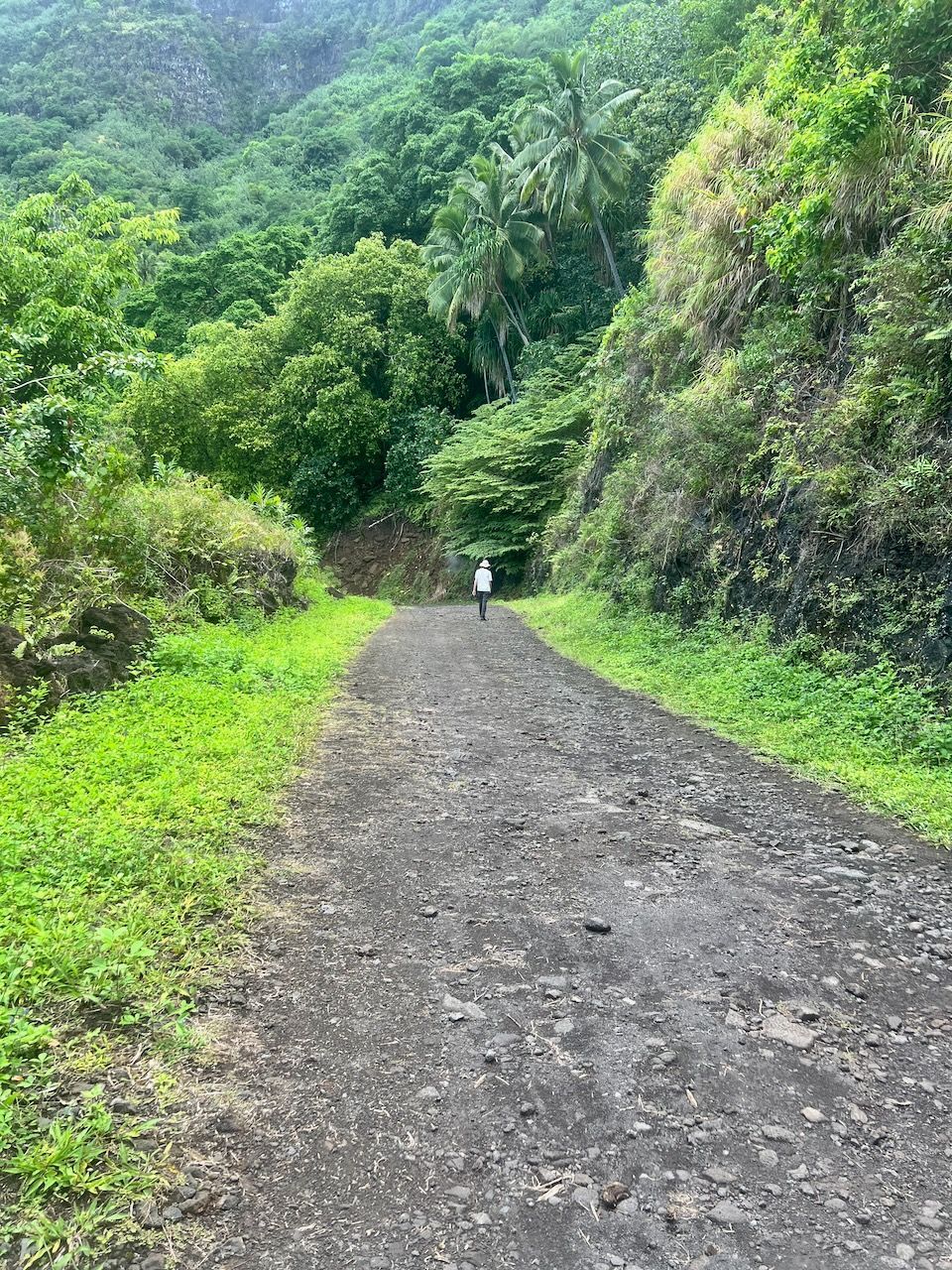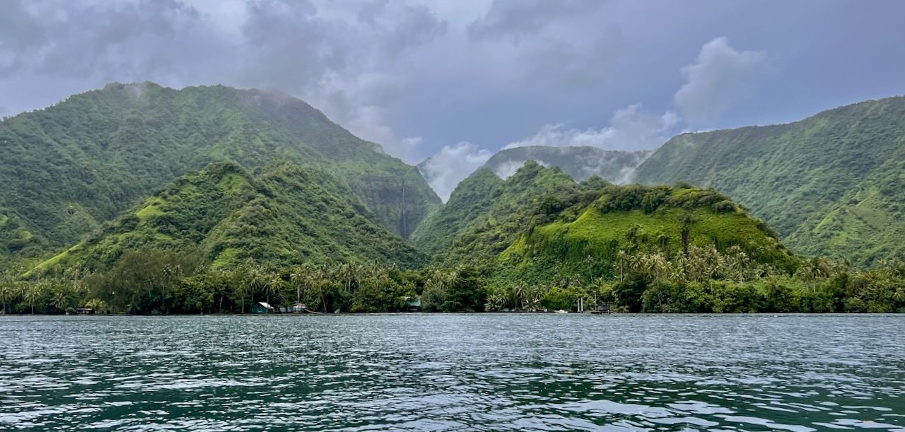 We will visit Tahuata, the island just south of Hiva Oa. It's a short boat ride across the turquoise ocean waters to the small village of Hapatoni. From there, we will walk along a road that winds through the forest to the village of Vaitahu.