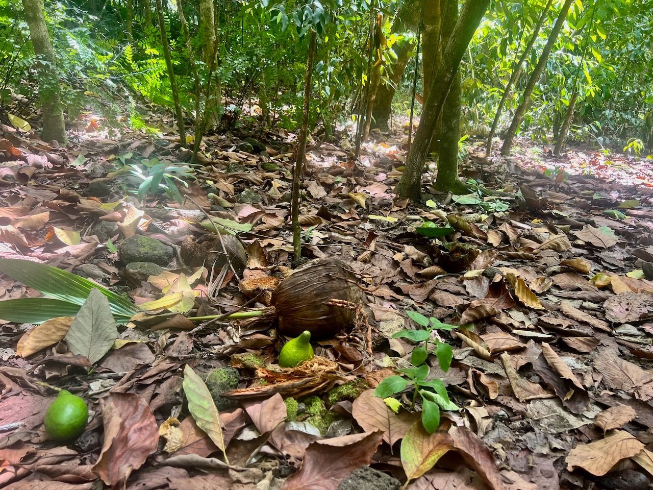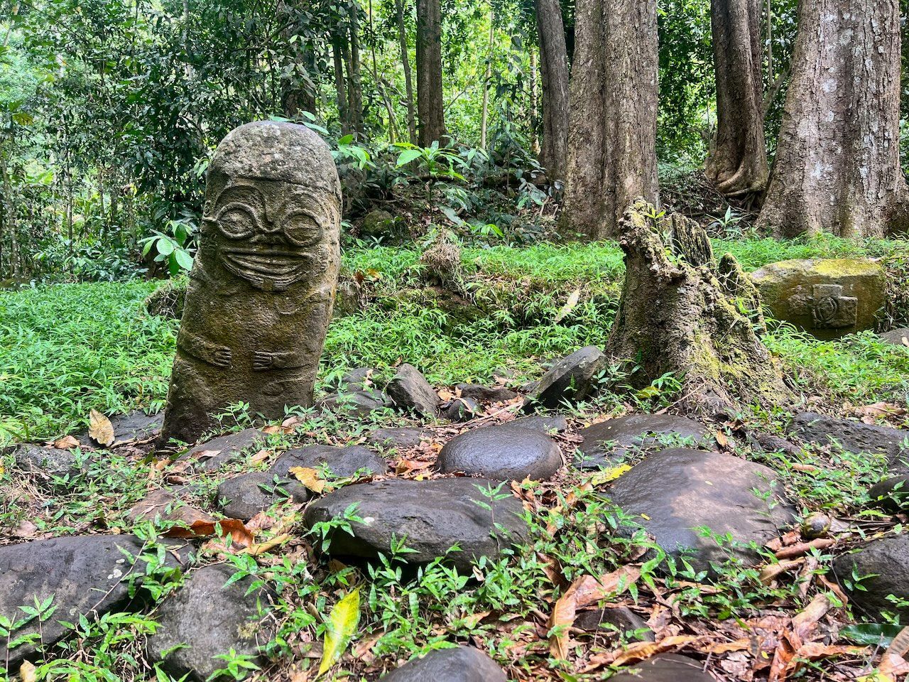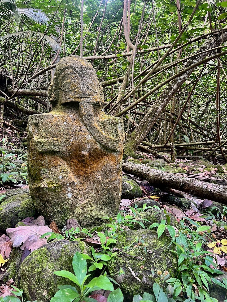We will visit Tahuata, the island just south of Hiva Oa. It's a short boat ride across the turquoise ocean waters to the small village of Hapatoni. From there, we will walk along a road that winds through the forest to the village of Vaitahu.