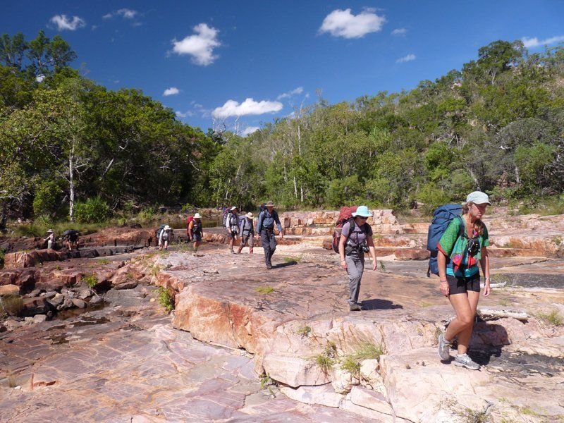 Much of the walking is through relatively flat, open woodland with a grassy understorey. Some short sections of grass may hide a broken rocky surface where you will have to be particularly careful. There are usually some sections of thick grass and/or spinifex which make for slow going. Gaiters essential, long trousers recommended.