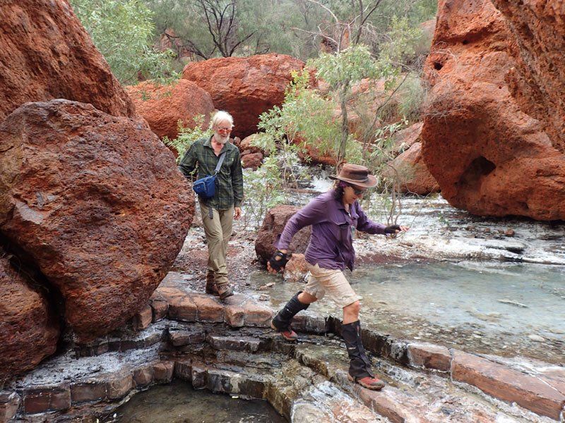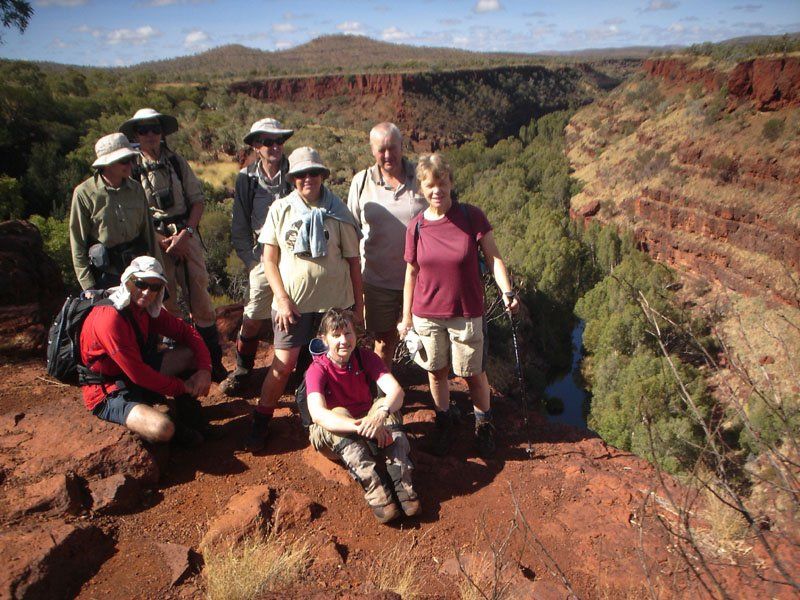 The terrain is a mix of open woodland, rocky and swampy watercourses and spinifex scrub. There will be a number of short but steep climbs and one long, steep climb down into Wittenoom gorge. Some of the optional day walks will include sections where you need to go along narrow ledges. Some sections go through thick grass that hides rocks so you need to watch every step. If it weren’t for the fact that we often do day walks from base camps, this trip would rate as HARD/level 4 rather than MODERATE/level three.
