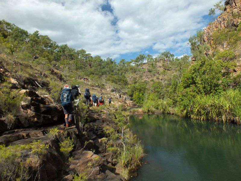 We begin with the long drive from Kununurra to the end of the Surveyors Pool track on the Mitchell Plateau. Most people do this as a day trip. We show you more. A relatively short walk brings us to our campsite on one of the creeks above the pool. We should have this to ourselves. A day walk without packs allows us to acclimatise while seeing places the day trippers can't even imagine.