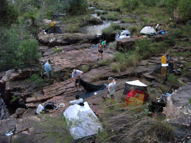 At the end of the first week, a helicopter brings in our food drop and takes us to Donkins Creek. We set up a base camp near our landing point and spend the rest of the day exploring the nearby rock shelters and the area above Donkins Falls which plunges over 100 metres into a narrow gorge. The following day we do a long loop walk down into the gorge below the falls and back.
