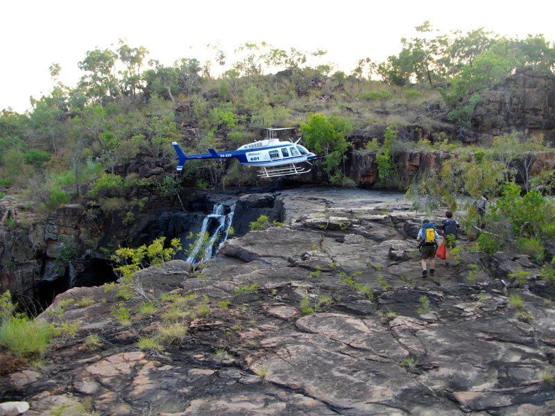 Food drop and flight to Donkins Creek. Those finishing here fly back to the Mitchell Plateau airstrip by helicopter and from there to Kununurra in a light aircraft.